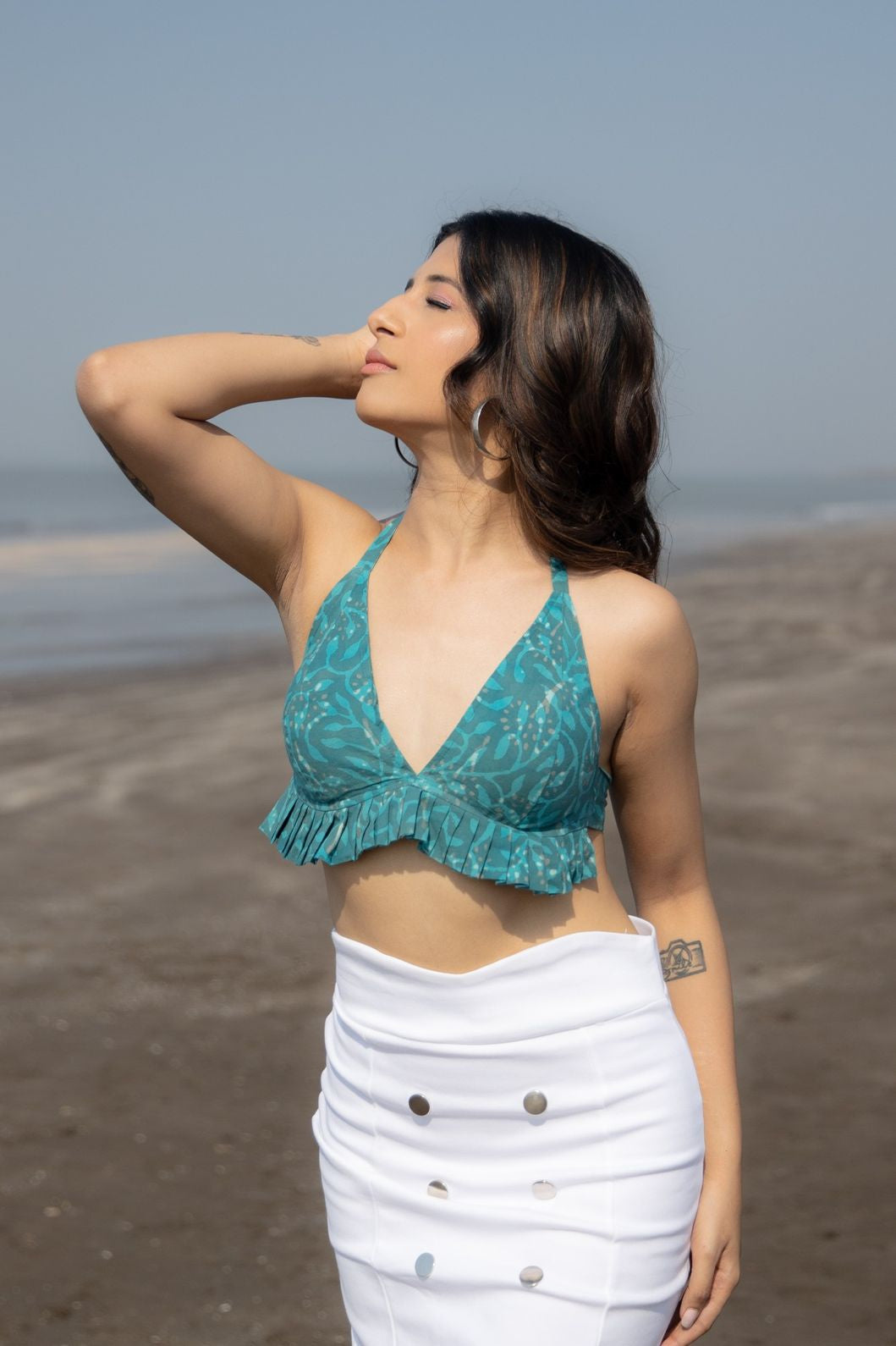 Sea Green Balloon Hand Embroidery Shirt and Bra Combo - KJ10200