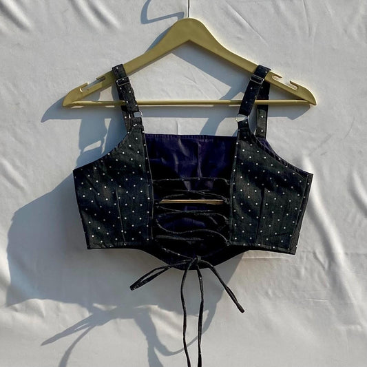 Denim Hand Embroidery Floral Shell Criss Cross Top - KJ10314