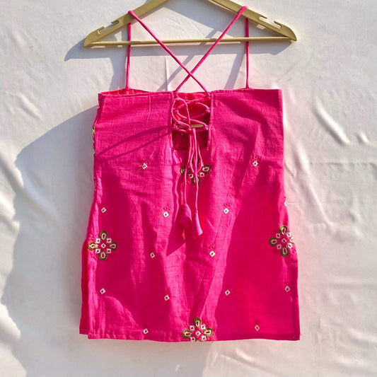 Multicolor Bandhej Deep V Neck and Back Criss Cross Kota Doria Removable Pad Kurti Top - KJ10335