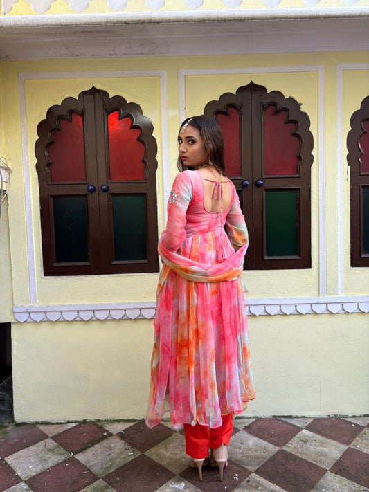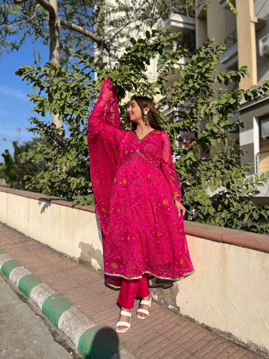 Pink Bandhej Mirror Chiffon Suit Set - AT0332
