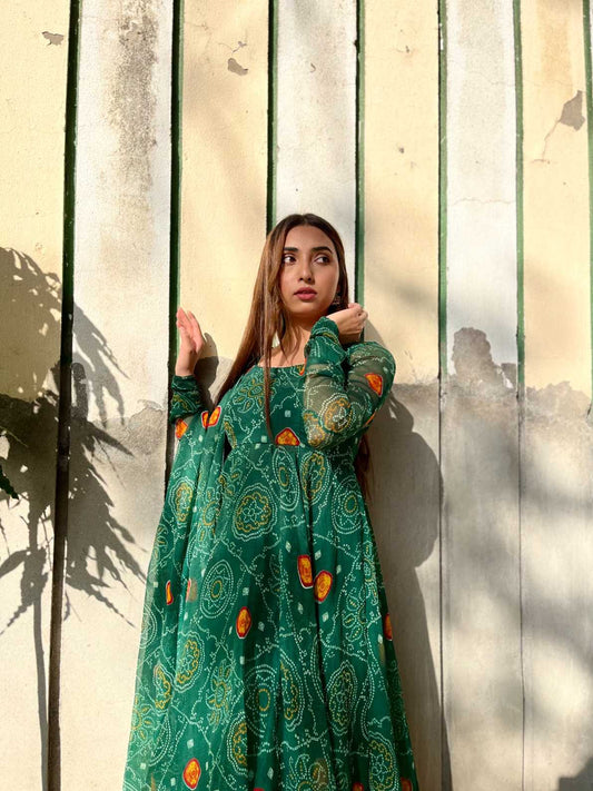 Bottle Green Bandhej Chiffon Suit Set - AT0330
