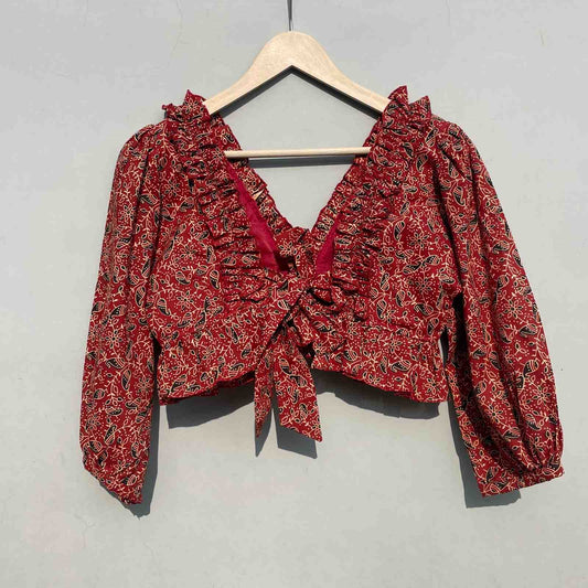 Red Kalamkari Frill Neck Puff Sleeves Cotton Top - KJ0301 (( Clearance Sale ))