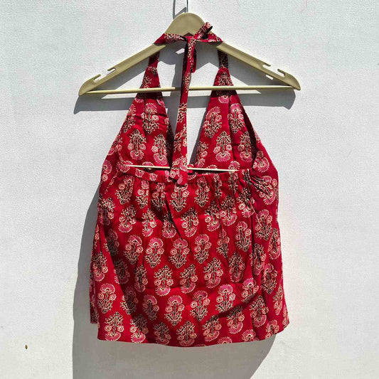 Pink Orange Lehariya Front Knot Halter Neck Cotton Top - KJ0137 (( Clearance Sale Item ))
