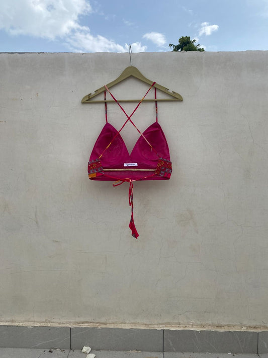 Red Piton Embroidery Halterneck Criss Cross Removable Pads Top - KJ10187