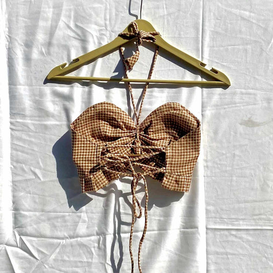 Cream Brown Checks Frill Halter Neck Removable Pads Top - KJ10265