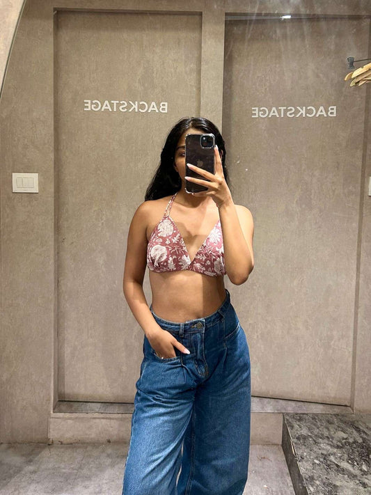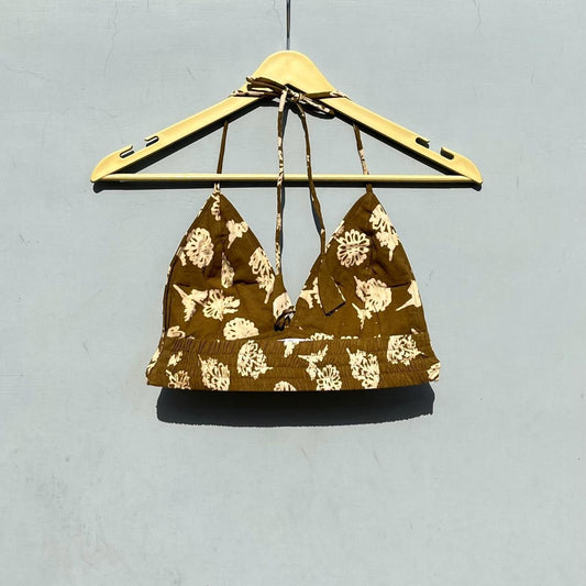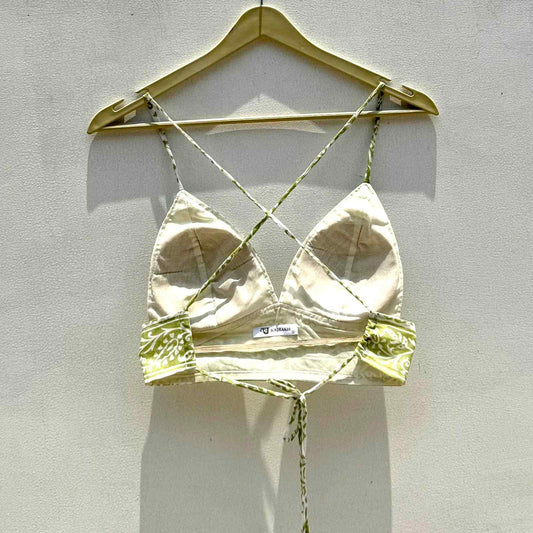 Olive Green Handblock Halter Neck Cotton Bra - KJ0587