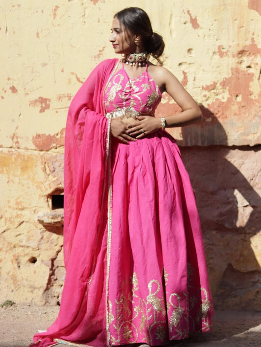 Pink Gotta Embroidery Blouse , Dupptta and Lehanga - KJ0675