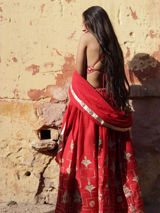 Red Gotta Embroidery Blouse , Dupptta and Lehanga - KJ0676