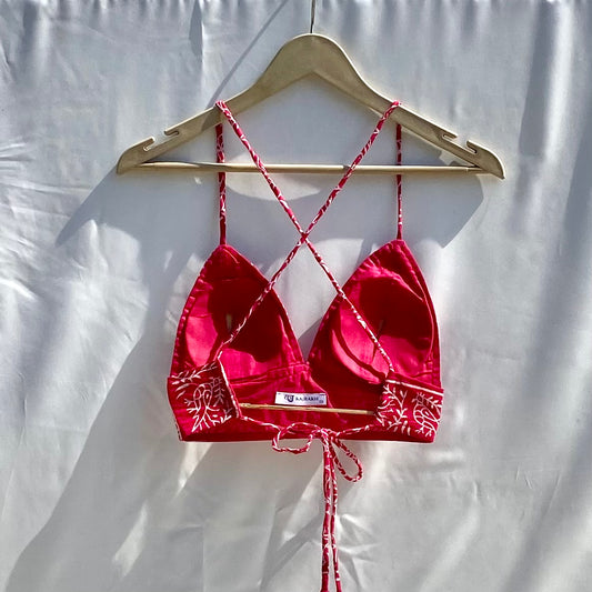 Red With Black Paisley Halter Neck Back Knot Tree Pure Handblock Top - KJ10355