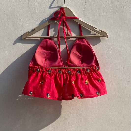 Pink Butti Embroidery Halter Neck Removable Pads Top - KJ0865