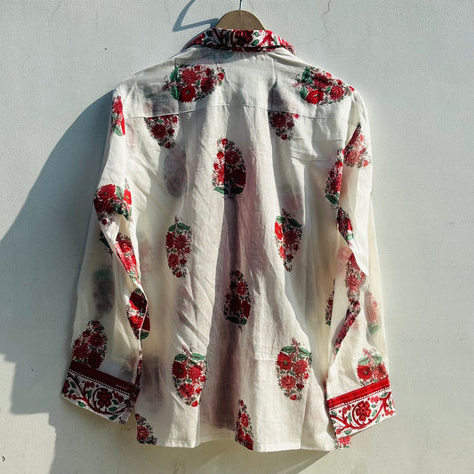 White Red Floral Patch Cotton Women Shirt - KJ0399A
