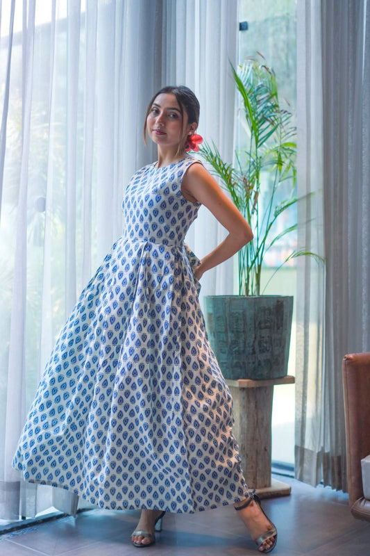 Blue Handblock Cotton Maxi Dress - 1550 - Gheraa10048