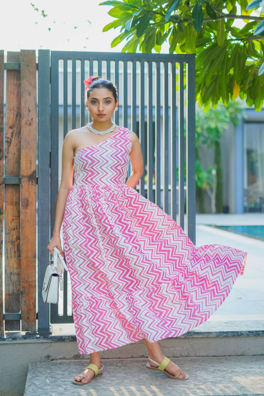 Pink Chevron One-Shoulder Cotton Maxi Dress - 1450 - Gheraa10049