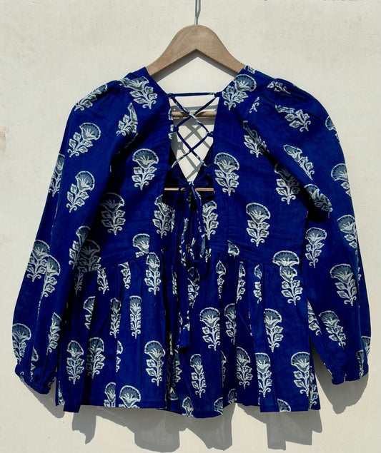 Blue Big Floral Butti Deep V Neck Full Sleeves Puff Criss Cross Removable Pads Top - KJ0900
