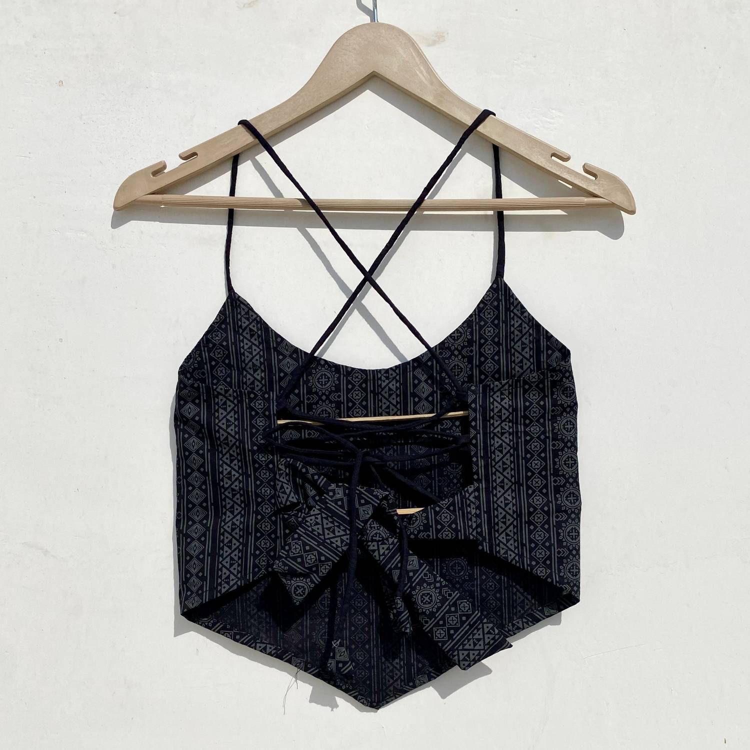 Black Self Print Back Knot Crop Shirt - KJ0966