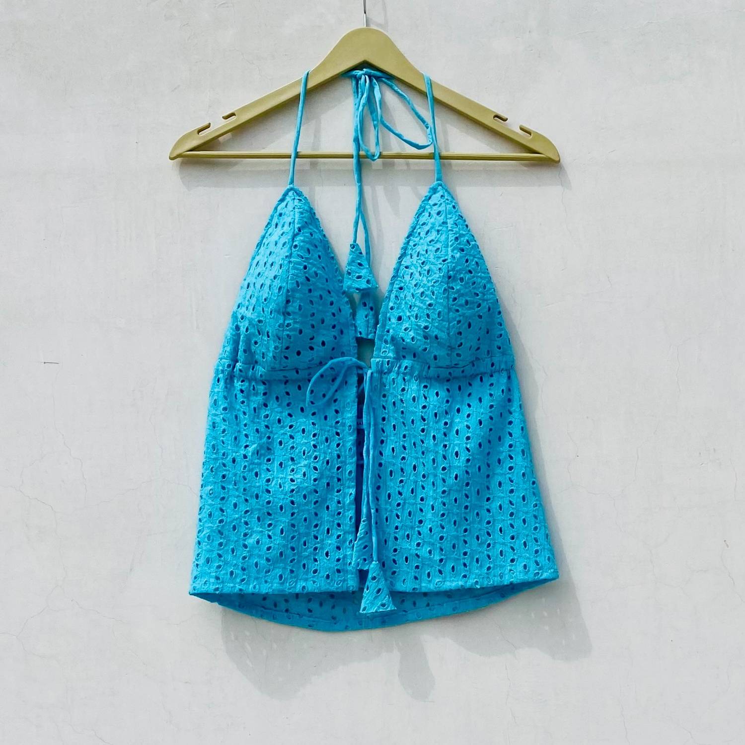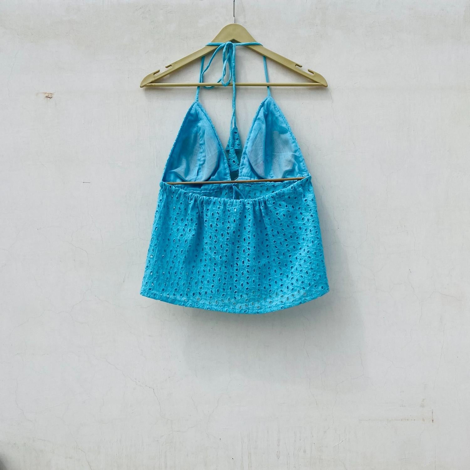 Blue Chikan Front Knot & Open Tree Removable Pads Top - KJ10076