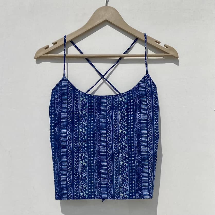Blue Geometry Criss Cross Back Knot Cotton Top- KJ0798