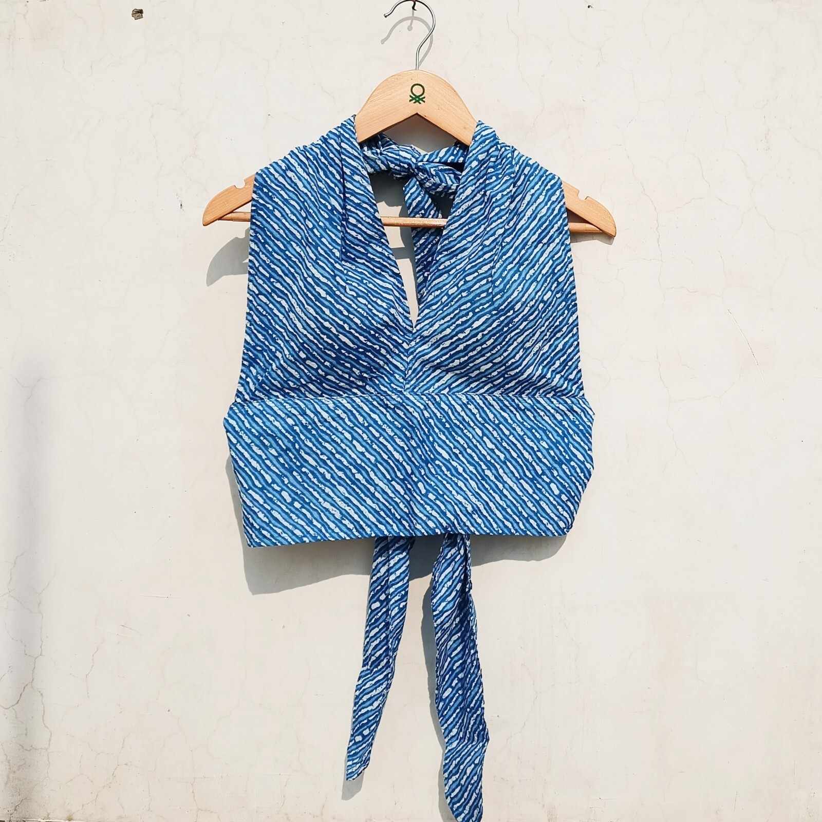 Blue Lehariya Back Knot and Halter Neck Padded Cotton Top - KJ0008