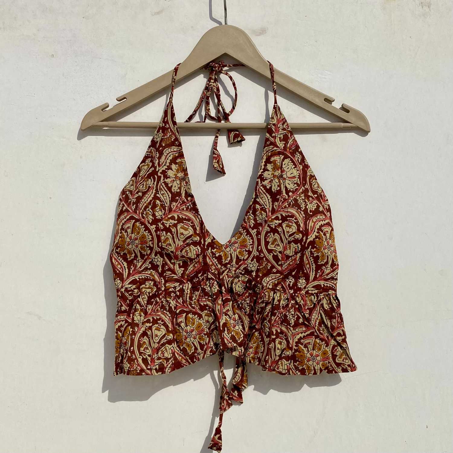 Brown Kalamkari Frill and Back Knot Removable Pads Bra - KJ0963