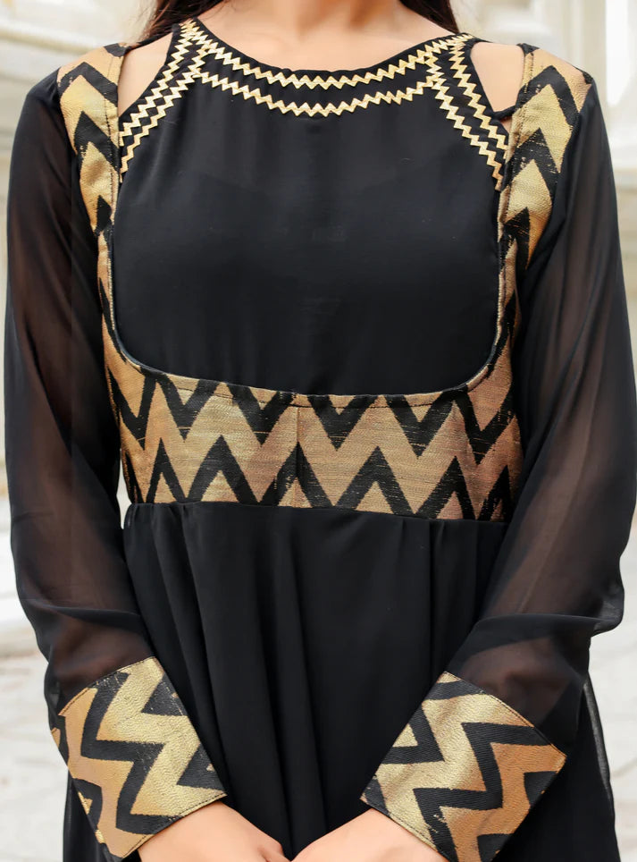 Make an unforgettable statement with our Midnight Noir, a stunning two-piece black Anarkali set crafted in soft georgette. Designed with golden detailing on the neckline and sleeves, and paired with a sheer net dupatta, this outfit blends elegance with bold sophistication.