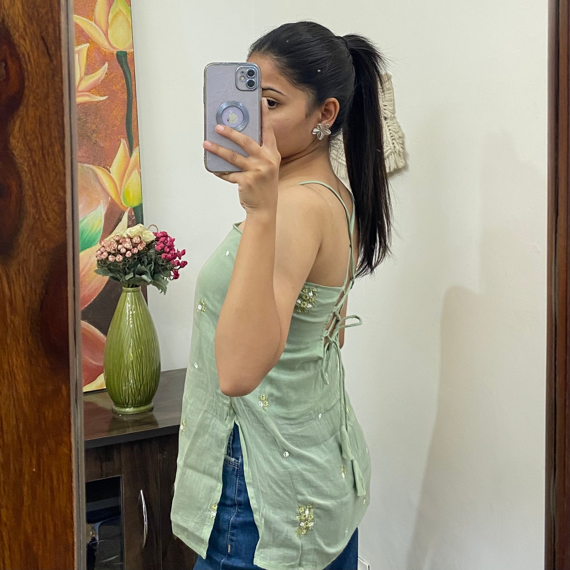 Mint Green Criss Cross Hand Embroidery Mulmul With Removable Pads Kurti Top - KJ10172