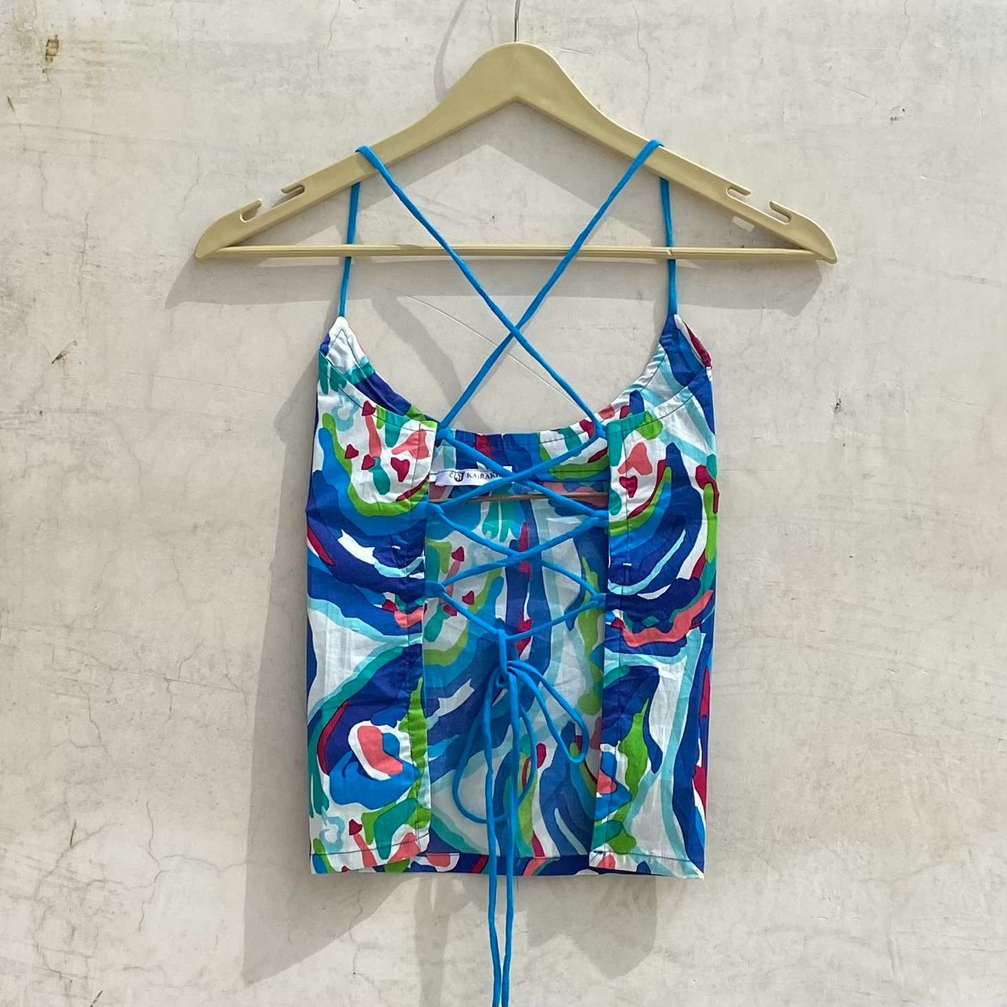 Multi Abstract Paint Criss Cross Back Knot Denim Top - KJ10188