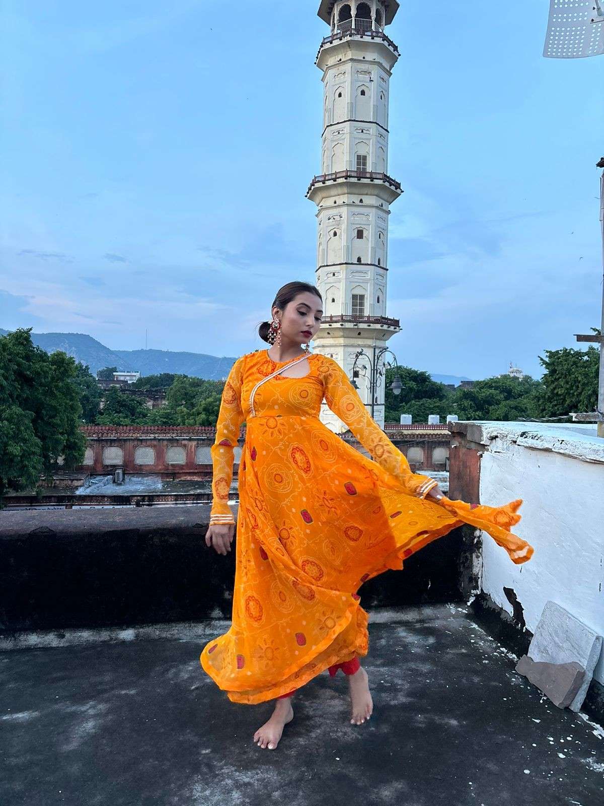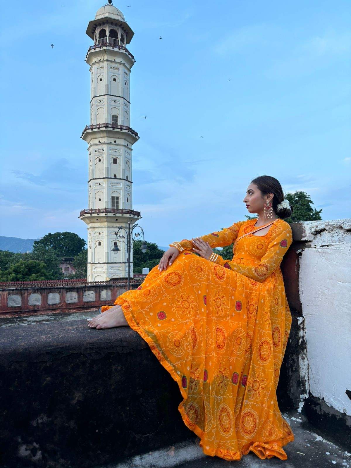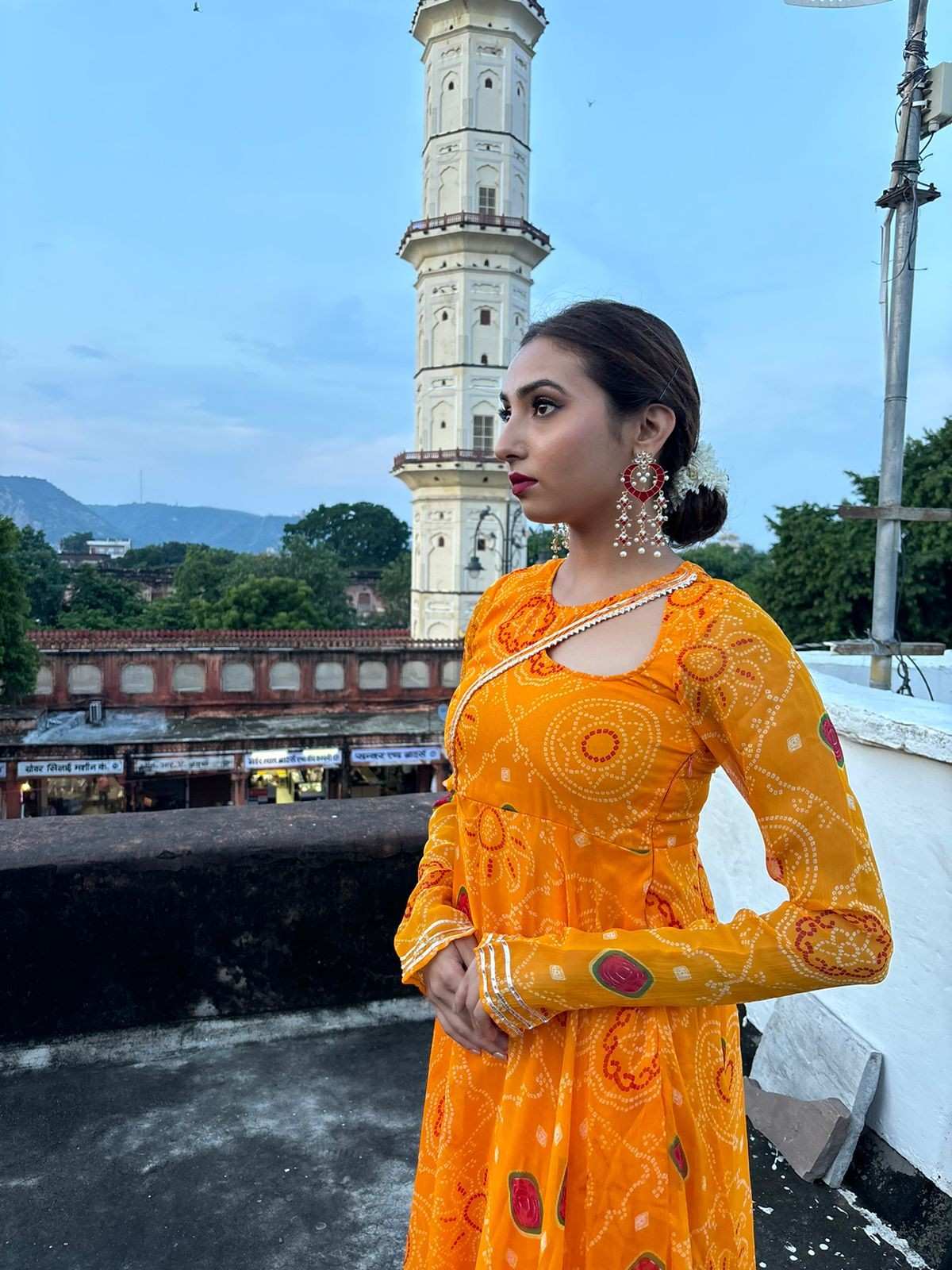 This Yellow Bandhej Kurti is crafted from soft, breathable chiffon, offering a perfect blend of tradition and style. The kurti features the timeless Bandhej (bandhani) print, with intricate tie-dye patterns that exude ethnic charm. Its lightweight chiffon fabric drapes elegantly, making it a comfortable yet stylish choice for both casual outings and festive occasions. The vibrant yellow hue adds a cheerful, radiant vibe, while the airy design ensures comfort throughout the day. This kurti is perfect for pairing with leggings, palazzos, or even jeans for a chic, effortless look.