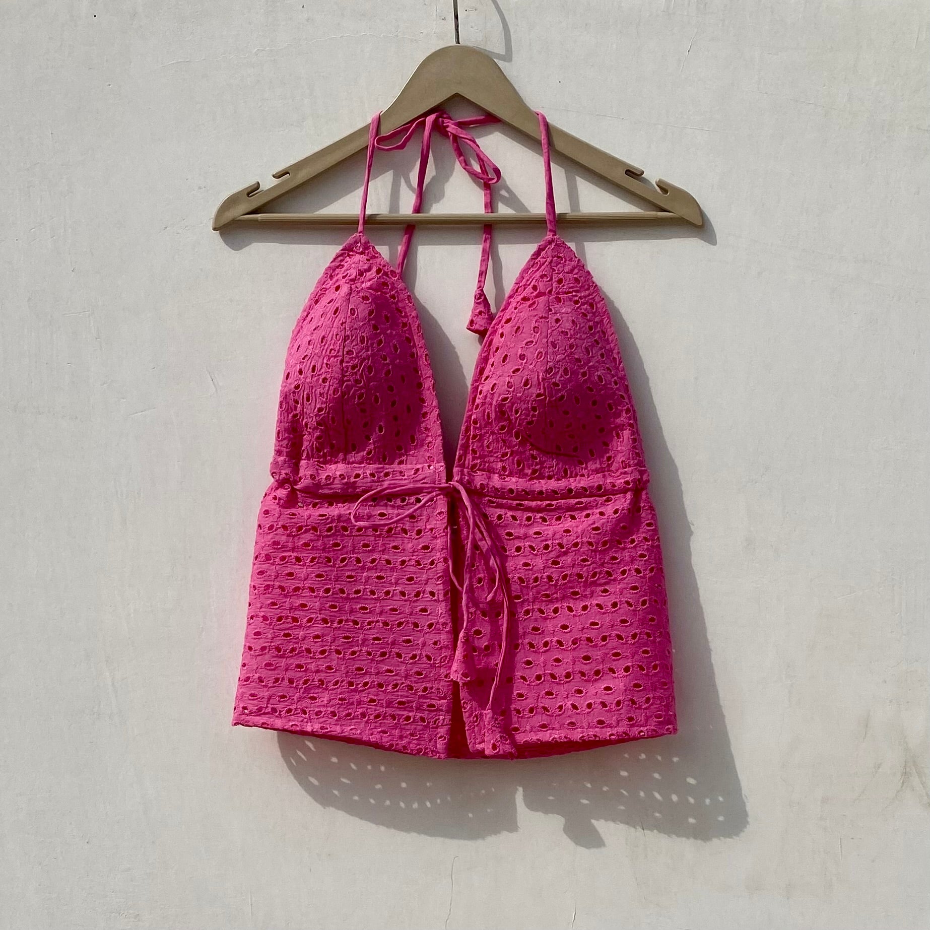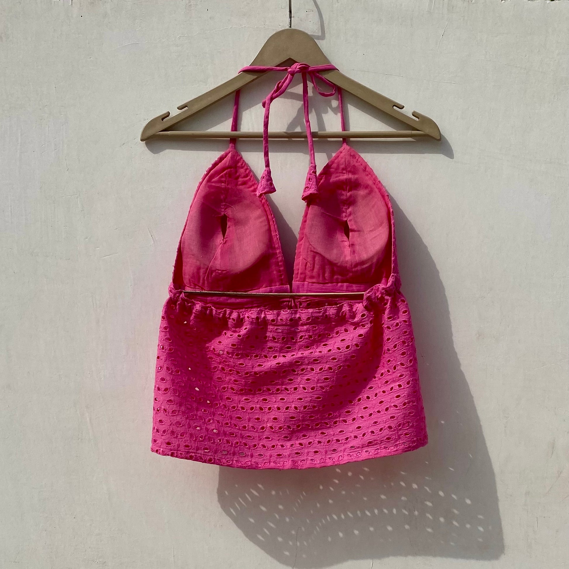 Pink Chikan Bow Removable Pads Top - KJ10026