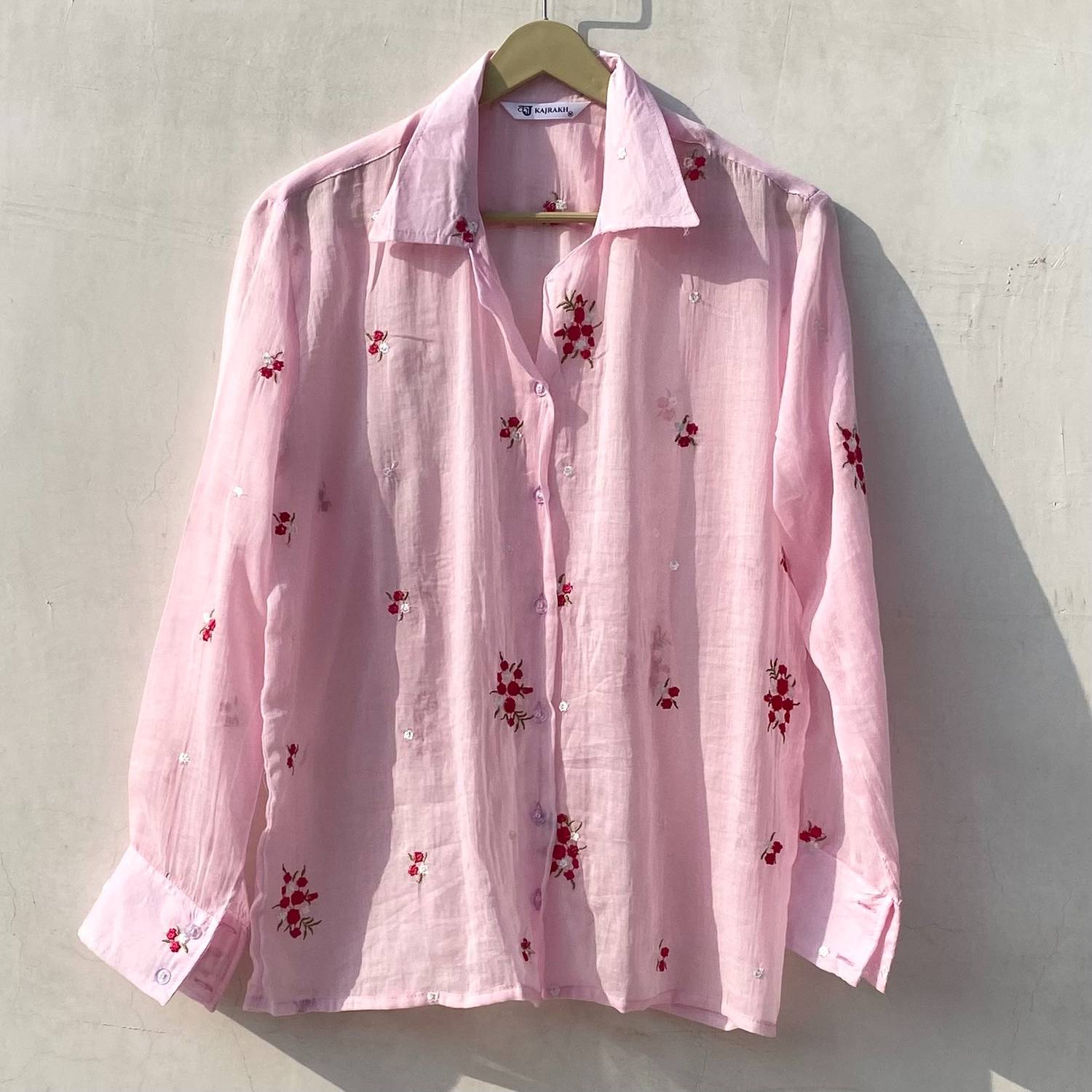 Pink Floral Thread Embroidery Cotton Women Shirt - KJ10167