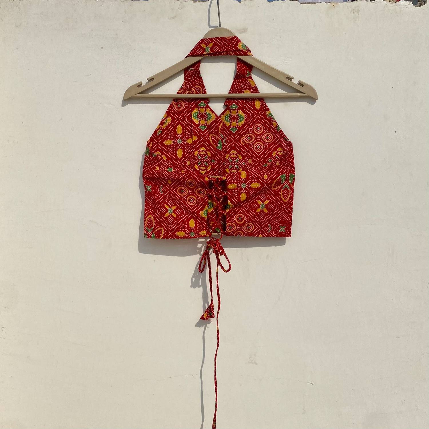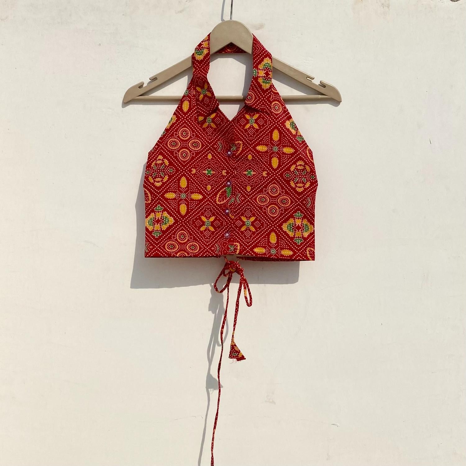 Red Bandhej Coraller Criss Cross Crop Shirt - KJ0965