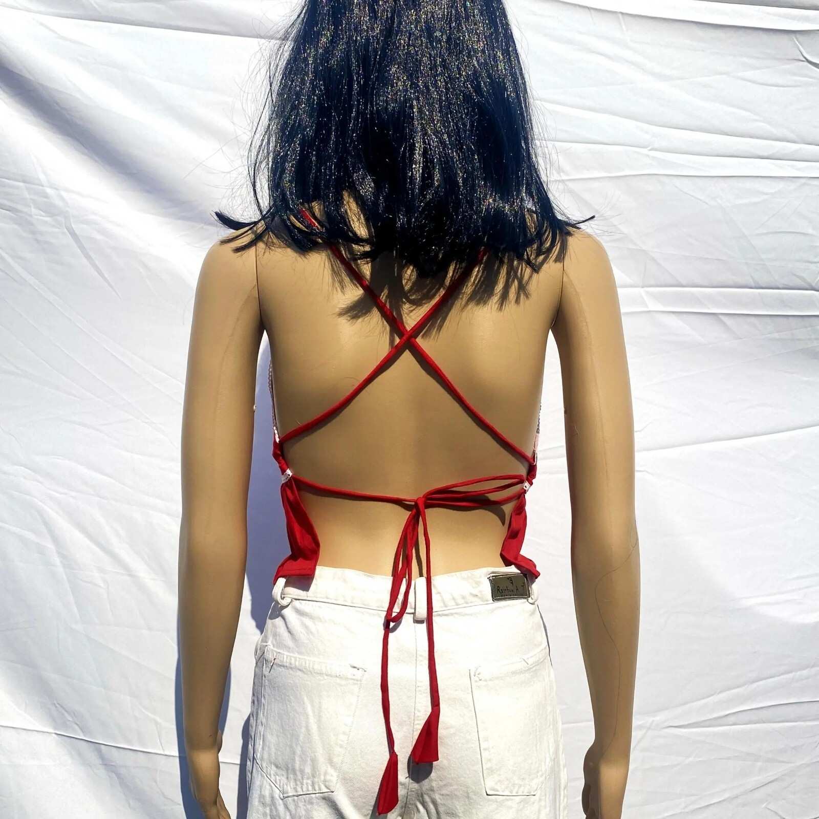 Red Chikan Lace Deep V Neck Padded Cotton Top - KJ0051