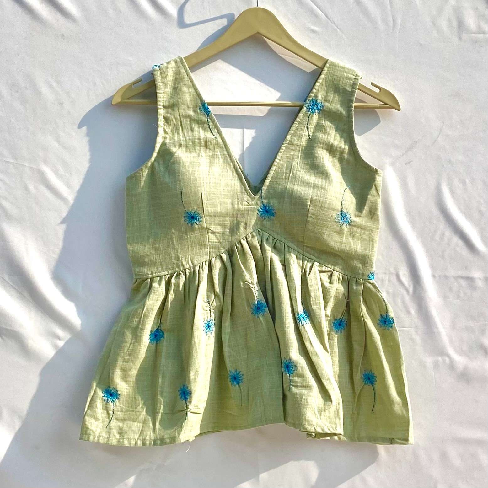 Sea Green Deep V Neck Floral Embroidery Cut Sleeves Top - KJ10311