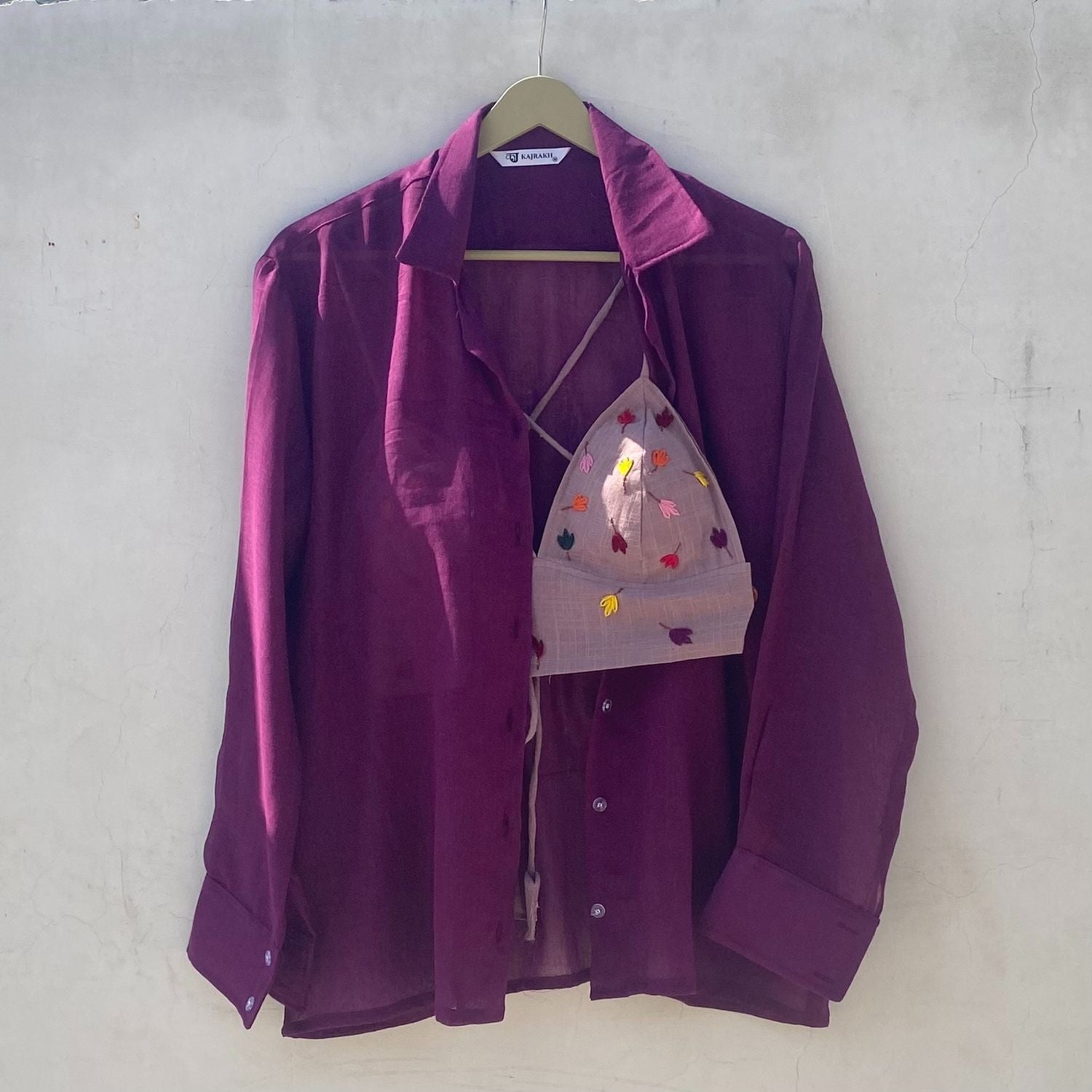 Wine Mulmul Patel Hand Embroidery Shirt and Bra Combo - KJ10201