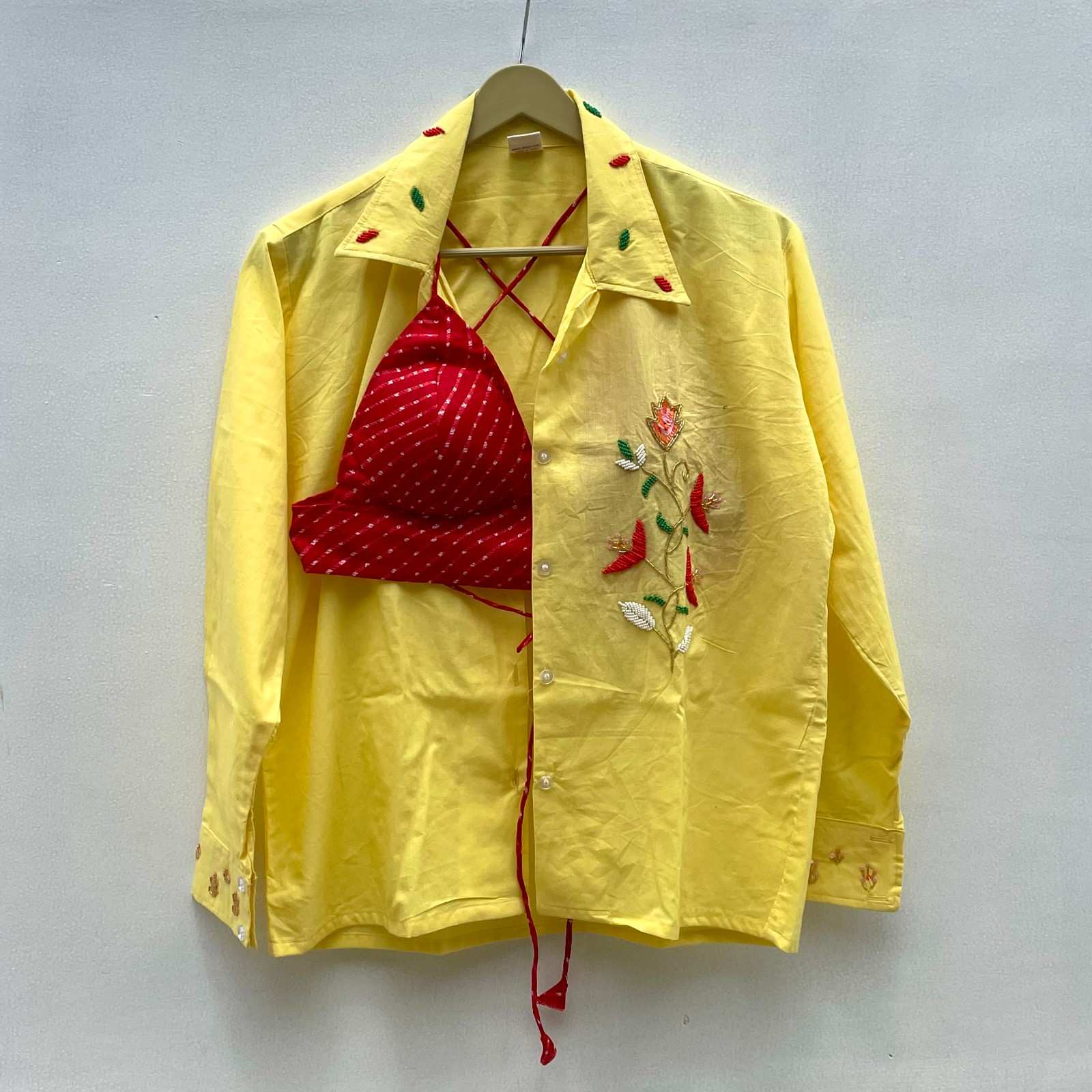 Yellow Embroidery Shirt & Red Lehariya Bra Combo - KJ0229